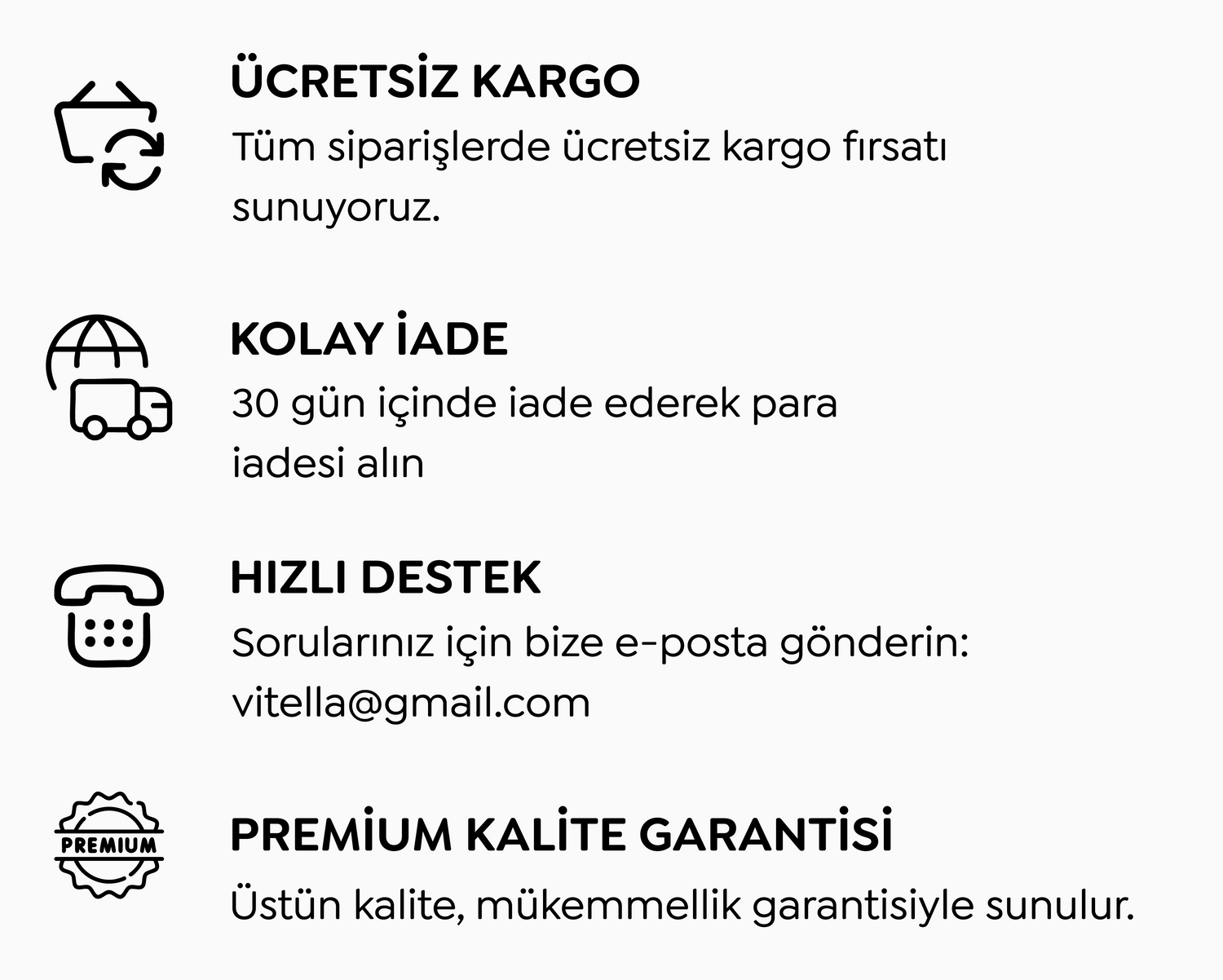 Siparişiniz 1-2 iş günü içinde kargoya teslim edilir ve ortalama 3-5 gün içinde adresinize ulaşır. Tüm Türkiye’ye kargo ücretsizdir.