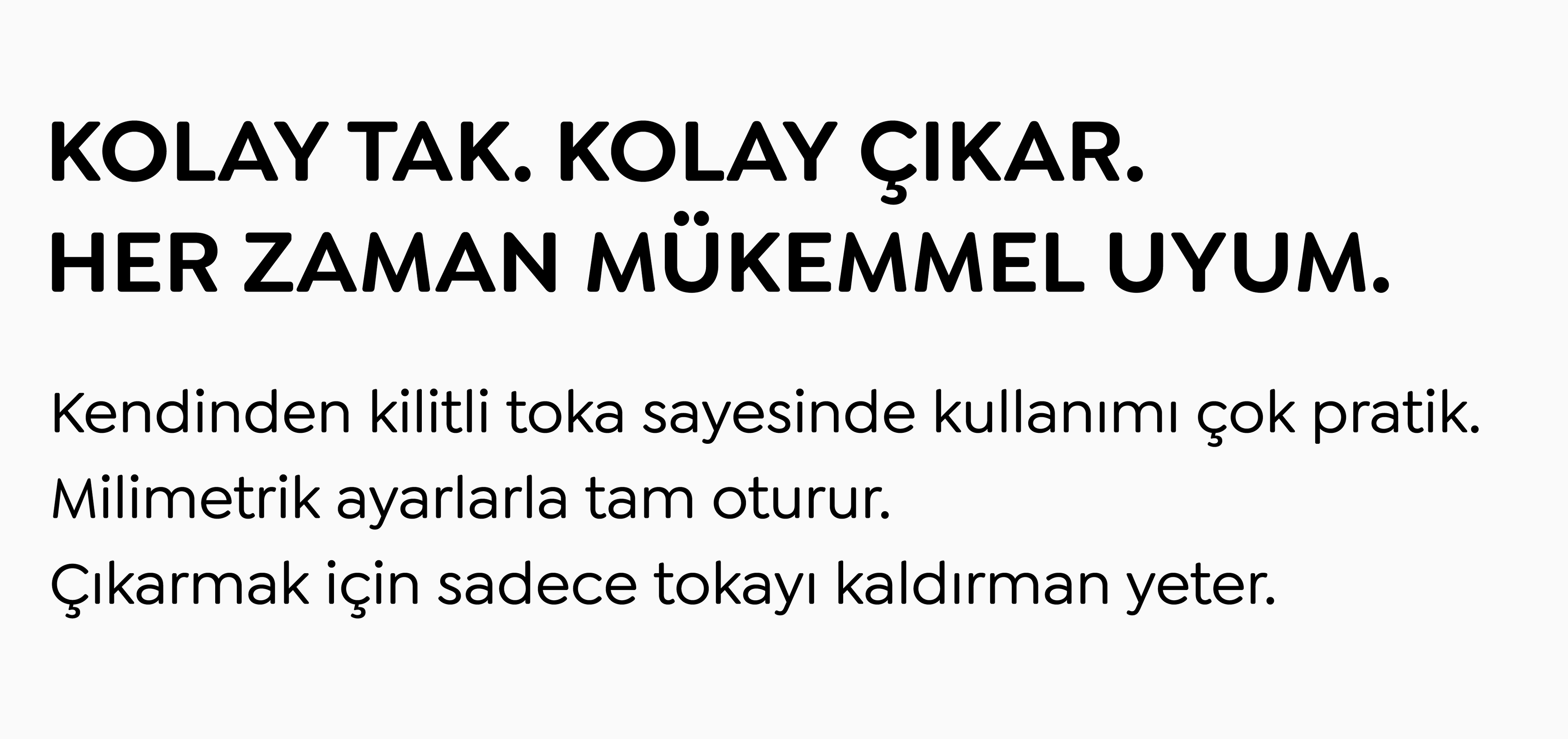 Kayışı tokaya geçirip hafifçe çektiğinizde, kemer otomatik olarak tam ölçünüze oturur.
